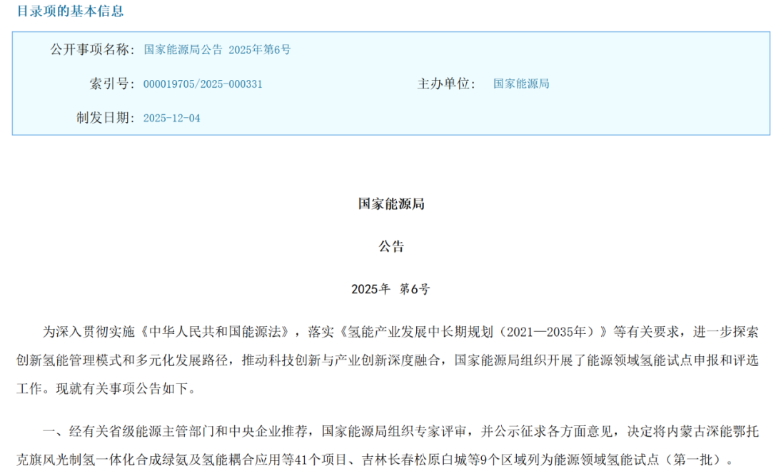 12月5日,国家能源局在网站发布2025年第6号公告,正式将内蒙古深能鄂托克旗风光制氢一体化合成绿氨及氢能耦合应用等41个项目、吉林长春松原白城等9个区域列为能源领域氢能试点(第一批)。